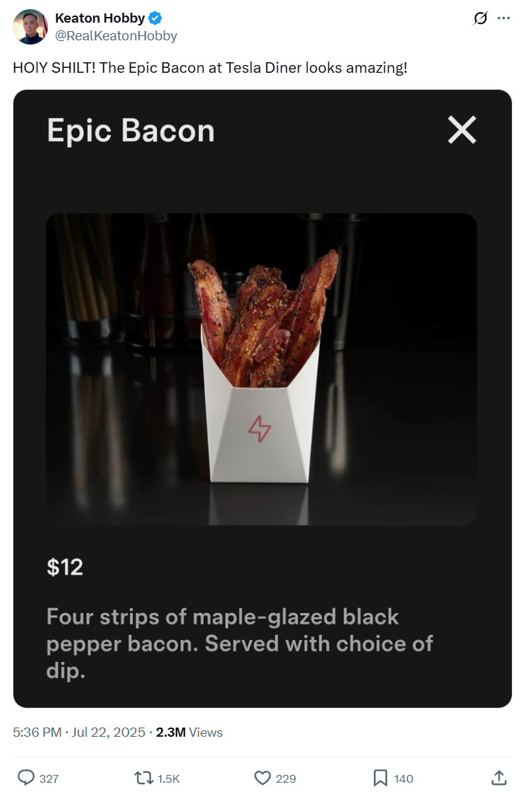 I have not been to Musk’s new Tesla Diner in Hollywood, CA, and so I can’t really review its food. From what I can tell, it is overpriced and underwhelming, a set of conditions that are antithetical to the concept of a diner in general. You’re allowed to have underwhelming food, but that shit better be cheap, in other words. Four strips of bacon for $12 and a $13 hot dog is absolutely not allowed.