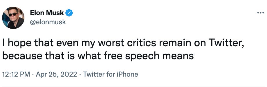 Musk has been vague about his specific intentions for Twitter beyond some platitudes about free speech, which he repeated today.