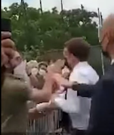 Far be it for me to endorse overt acts of violence against the ruling political class — heavens no! Having said, that, please, watch this video of French President Emmanuel Macron getting the shit slapped out of his vulpine punim this morning, and tell me it doesn't give you a little tingle of pleasure in the less-evolved, reptilian part of your brain.