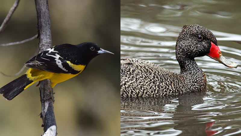 Here are two birds that make your eyes pop with delight and wonder at what nature can do. That yellow and black! Those freckles! It pains us that only one of these birds can win, but….only one of these birds can win. Good luck with that one.