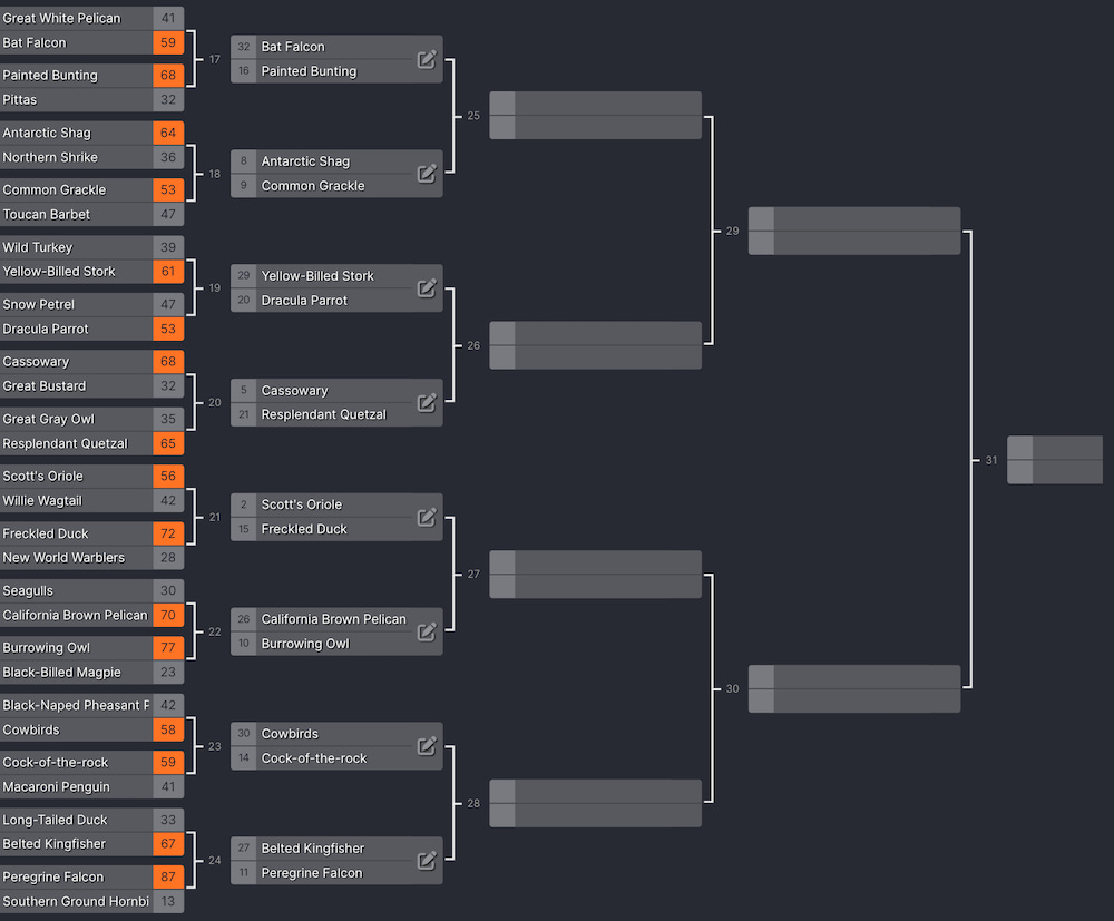 But now we must turn to Round Two. 16 birds are left. The stakes are even higher. Here’s what the bracket looks like.