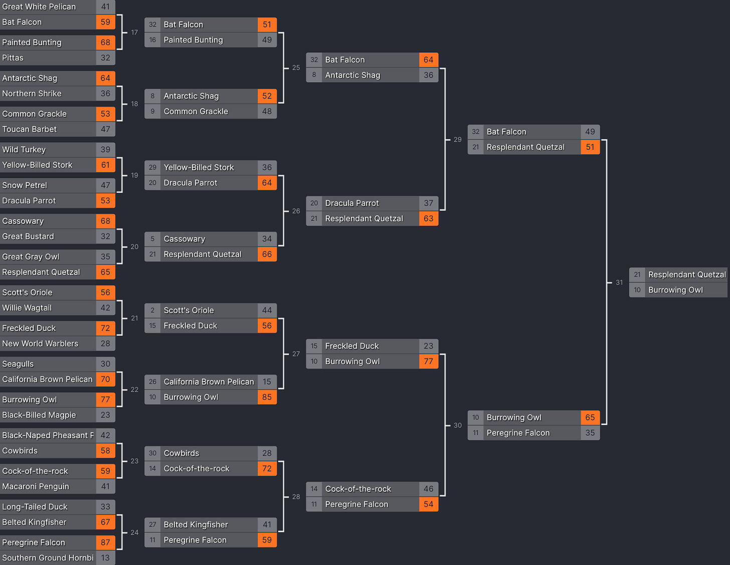 You want another data point about the power these birds have? They both just beat a falcon in the last round. That’s right: birddom’s most ferocious predators were no match for these two. The quetzal squeaked past the bat falcon 51-49, and the burrowing owl blazed past the peregrine falcon—the real-deal peregrine falcon, the fastest animal alive—65-35. Whew!