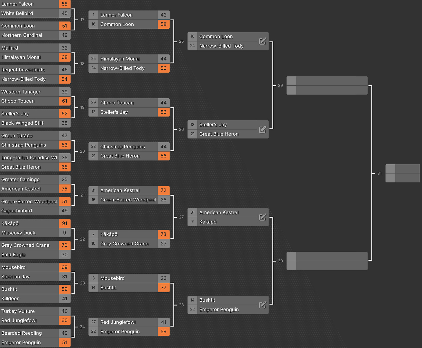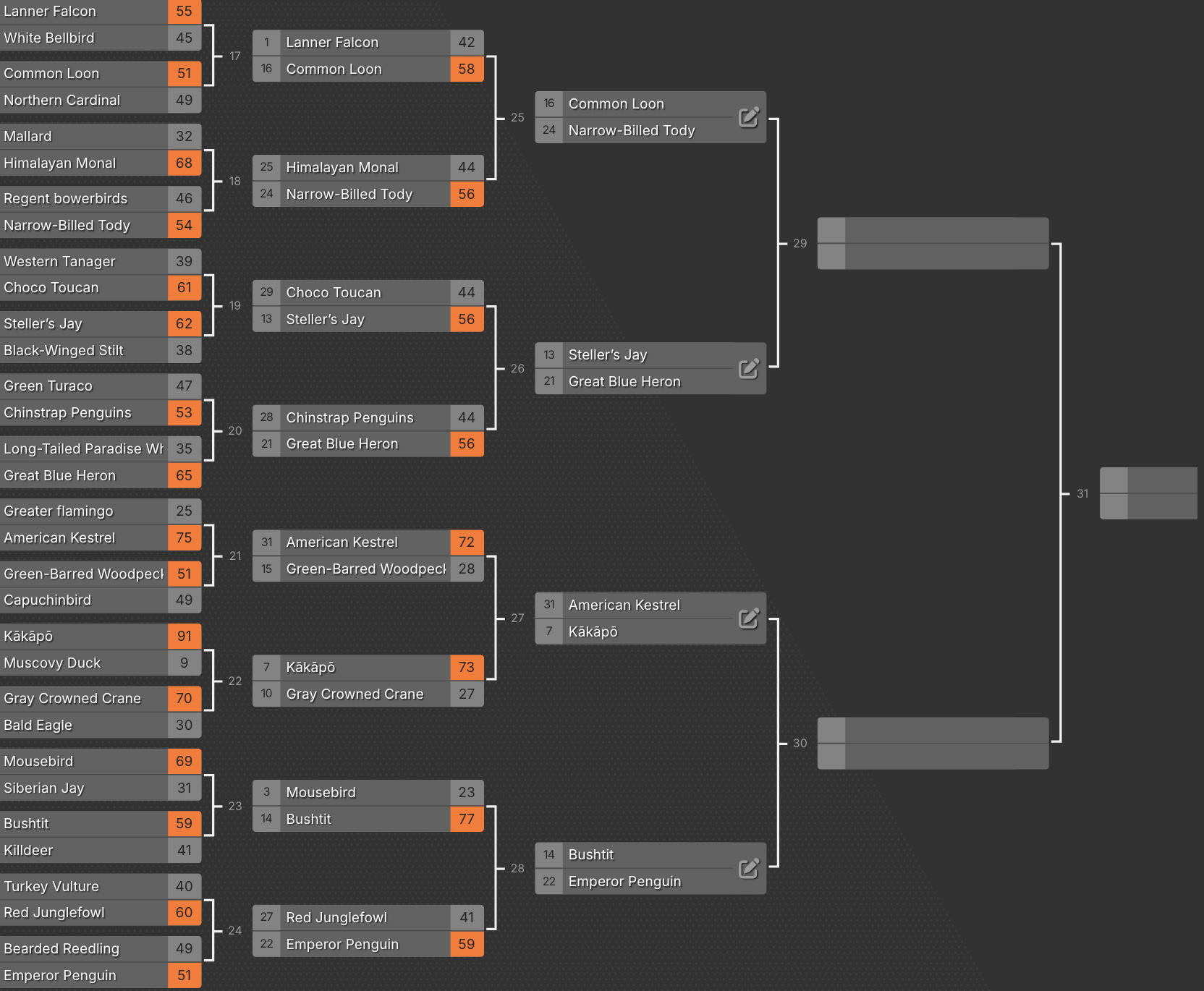The loon and the tody both dispatched their rivals with ease. Who knew a killer falcon and a large beautiful monal could be felled so quickly? Now they face their biggest rival: each other.