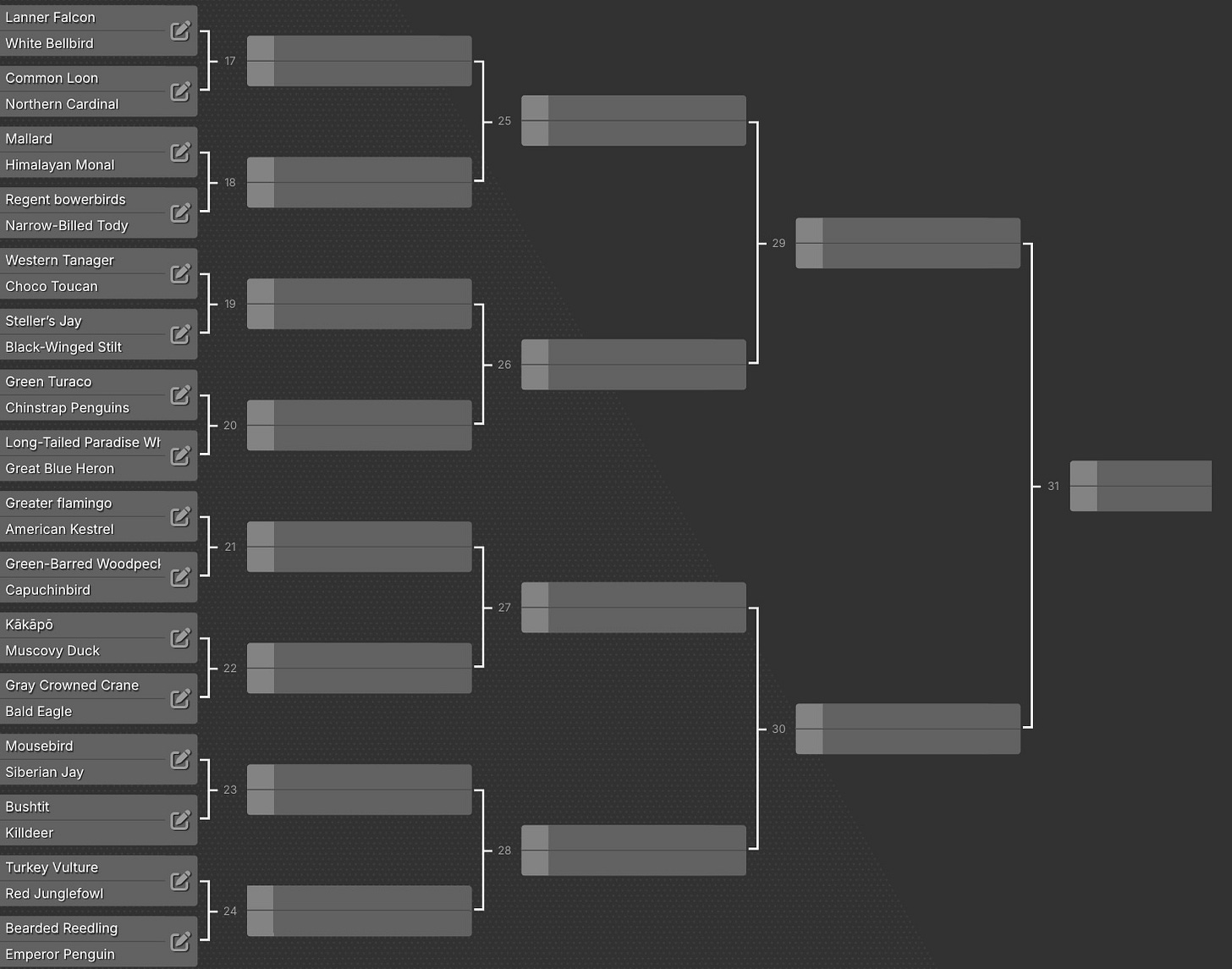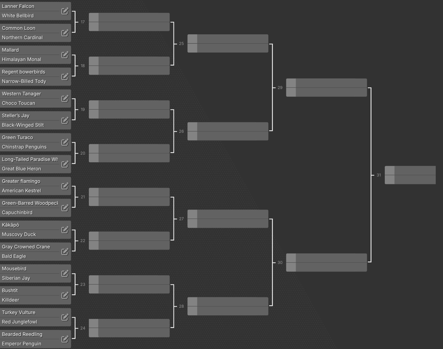 Let’s see the bracket. These are all birds that have never featured before in Fowl Hysteria.