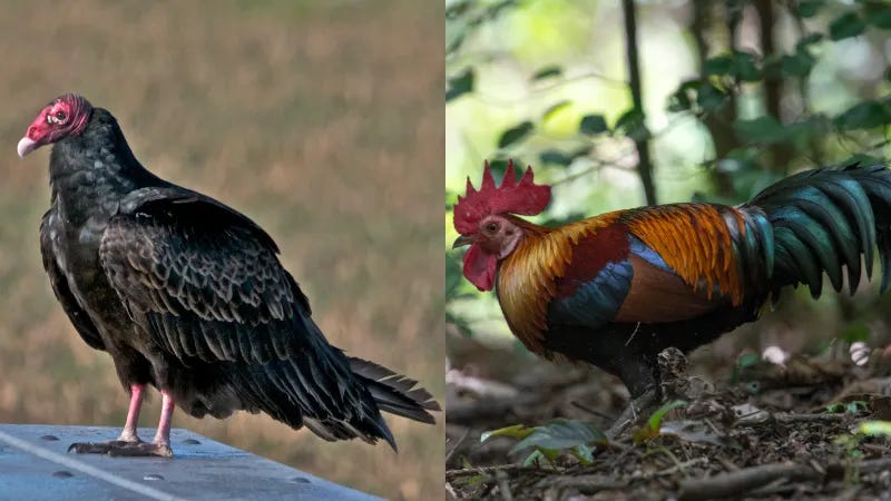 Could two birds be any less like each other? Probably….but also no. The world’s most towering carrion-eater meets the bird that spawned the chicken (really).