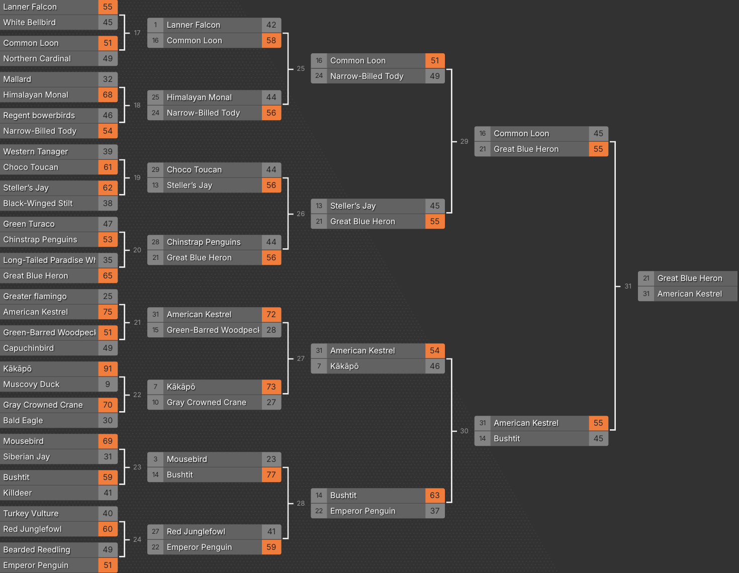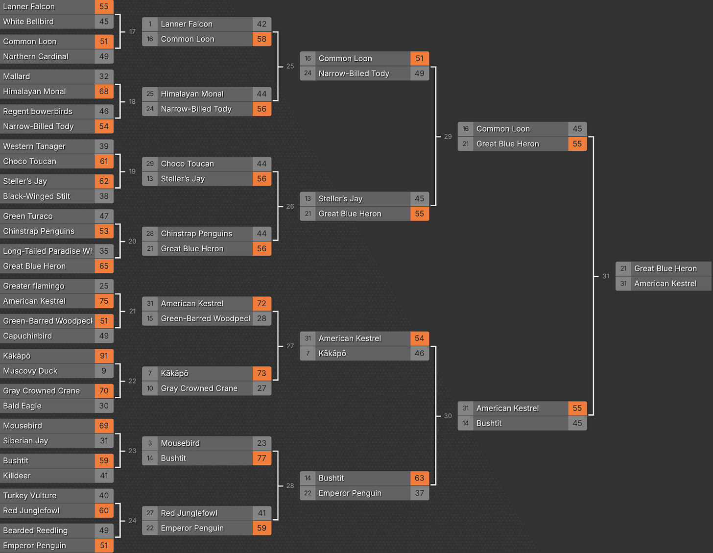 Before we get into this, we wanted to congratulate our two runners-up, the common loon and the bushtit. They fought valiantly, they remain some of the greatest birds in the history of birds, and we love them forever.