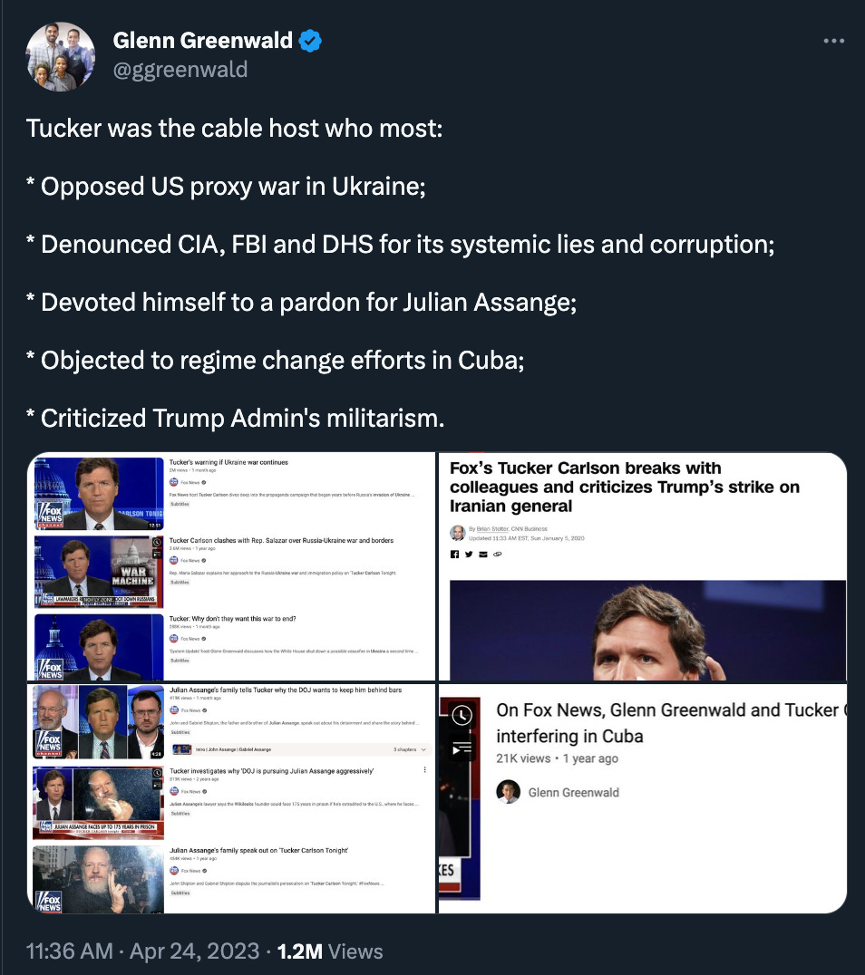 Network staffers were reportedly heartbroken by the news, sharing messages of solidarity with their now-deposed figurehead like “good riddance,” “pure joy,” and other inspiring sentiments that really speak to how beloved Carlson was amongst the cable news giant’s rank and file. Fox shareholders, paragons of moral fortitude that they are, reacted with similar grace and humility, tanking the network’s stock by nearly a billion dollars in the hours after Carlson’s outster. Glenn Greenwald was Extremely Chill And Normal about the whole thing.