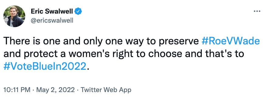 Democrats have coasted forever on the assumption that Roe would never be overturned, despite the GOP and its base openly saying that Roe should be overturned. They used this absurd middle ground to indulge anti-abortion rhetoric and policy and let the anti-abortion politicians within their ranks call the shots. They fundraised and campaigned off of fears around Roe while never lifting a finger to codify it into law. They refused to reform the Supreme Court in any way that would have prevented this outcome. It has been crystal clear that Republicans were doing everything they could to eliminate the right to an abortion in America. Democrats haven’t seemed to care all that much.