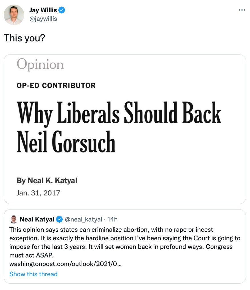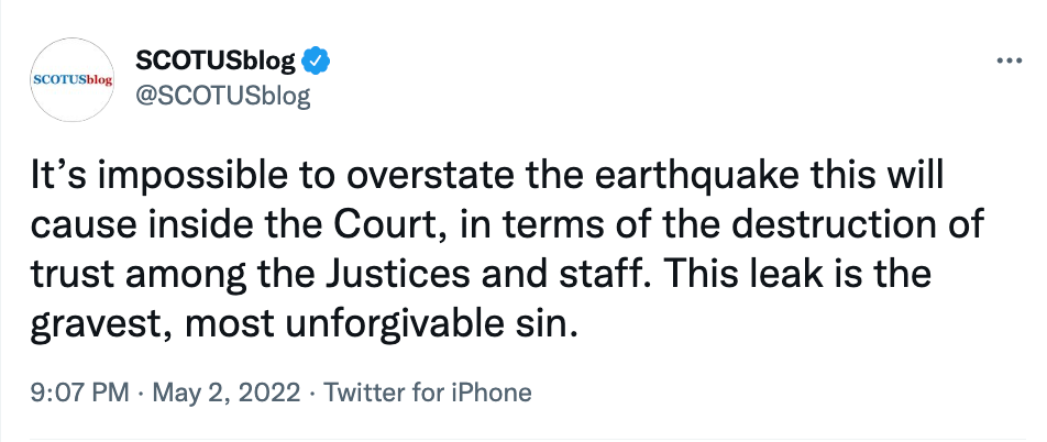 Oh no, not the trust among the justices! What if John Roberts and Elena Kagan don’t hang out as much after this? What if Clarence Thomas becomes more suspicious??? Fuck you!!!! We are in this position precisely because outlets like SCOTUSblog place more of a premium on how our institutions function than on what they actually do. They can operate with intrinsic violence and impunity, but as long as they do so while still maintaining a veneer of civility, the SCOTUSblogs of the world are untroubled. I don’t want to harp too much on the “this is how fascism happens” stuff, but this really is how fascism happens: elites who are so focused on “rules” and “order” that they allow their basic morality to wither away, and blithely watch as the rest of us get trampled underfoot.