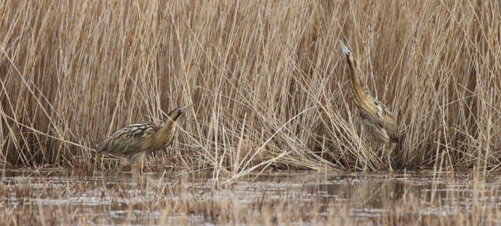 The "practically extinct" part is true—the bittern used to be in England, then vanished completely in the late 19th century, then came back in the 20th century, then was facing extinction in the UK again, and is now making another recovery, though there are still just a couple hundred of them in the country. (The bittern isn't doing too badly overall, though—it can be found all over Europe and Asia and in many parts of Africa too.)