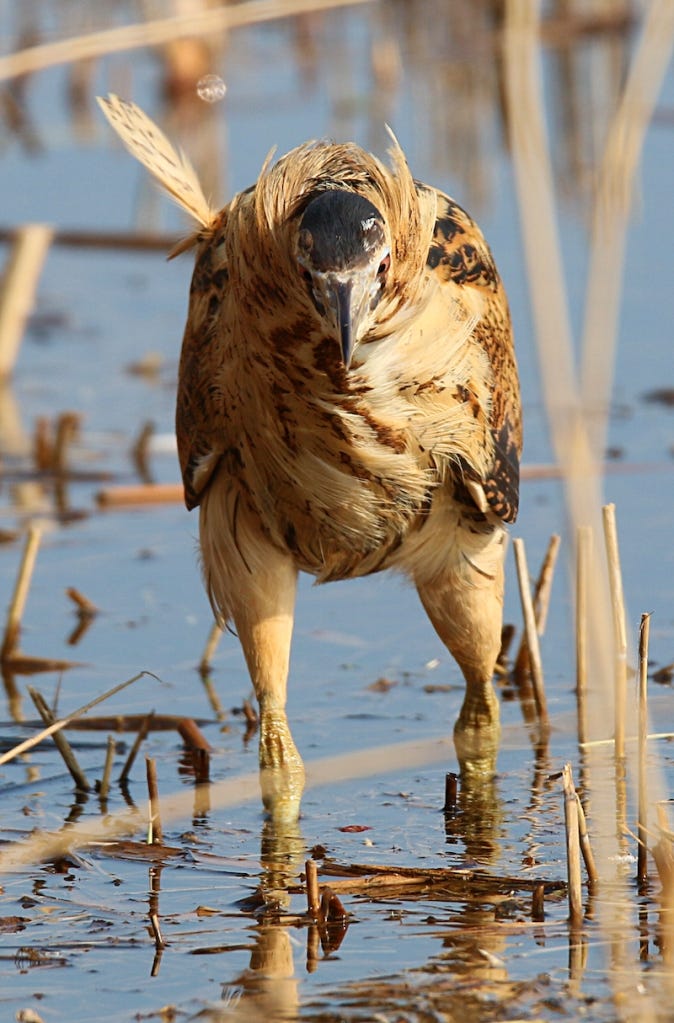 The Eurasian bittern is a master of stealth and camouflage. Its plumage of streaked brown, grey, and black allow the bittern to blend in with its surroundings. When startled the bittern extends its neck and body such that the streaks on its body parallel the surrounding vegetation, the bittern can even sway parts of its body to cast the illusion of reeds blowing in the wind. A skilled fisher, the bittern often approaches a fishing spot disguising its presence by leading with its camouflaged neck until an opportune time to spear/catch a prey item arises.