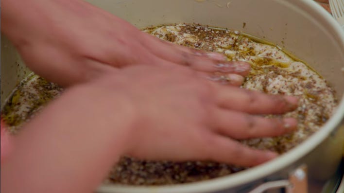I’ll say!!!!!! Throughout the challenge, we see several shots of the focaccia in progress, and hear Crystelle saying things like, “I only learned this from Bread Week, but it’s supposed to be so oily. So I just feel like, the more oil, the better,” accompanied by shots like this: