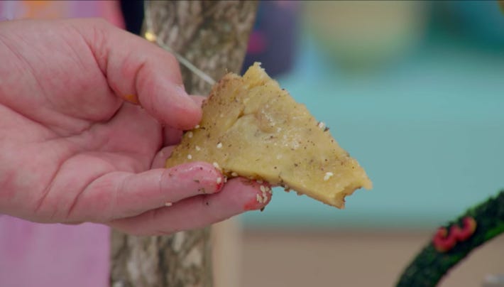 As a baker myself, I suppose I can and should accept this as a sufficient explanation. Baking is hard and alchemical. Sometimes its mysteries elude even the most studied and skilled bakers. And yet, I can’t help but wonder how the focaccia fallout occurred. Inedible, raw dough doesn’t just happen! That said, I do appreciate that Bake Off doesn’t feel the need to dwell on these dramas, which they could easily tease out for minutes on end. It all feels quite British actually, and the restraint serves as proof that the show needn’t continue down the path of outlandish challenges to stir up chaos. Baking itself is enough. Let us not, after all, forget Bingate, the absolute greatest Bake Off drama of all time.