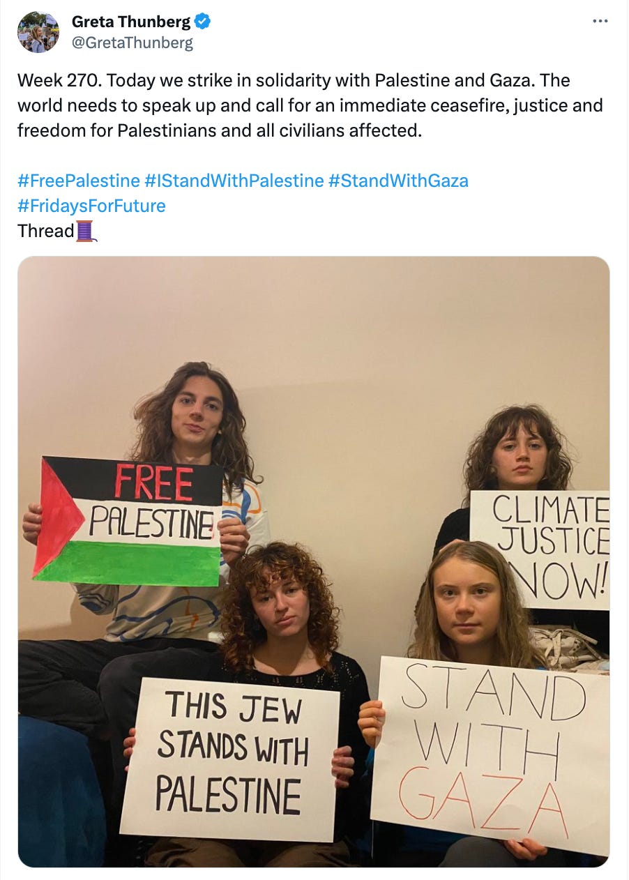 Most of Thunberg’s posts to her millions of followers are about climate demonstrations. That makes sense, the brand is strong. But on October 20, she posted photos to Instagram and Twitter holding a sign that read, “Stand with Gaza.” She captioned the photo: “Today we strike in solidarity with Palestine and Gaza. The world needs to speak up and call for an immediate ceasefire, justice and freedom for Palestinians and all civilians affected.”