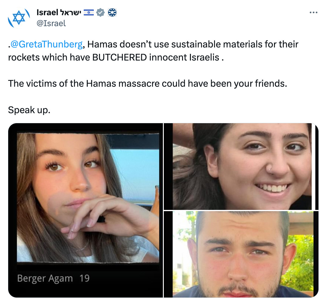 Of course, nothing has been more extreme than the response to Thunberg from Israel itself. The very same day her posts went up, a spokesperson for the Israel Defense Forces told Politico: “Whoever identifies with Greta in any way in the future, in my view, is a terror supporter.” He later retracted those comments, but I don’t really know why because they’re fairly on par with what Israel’s official Twitter account posted: