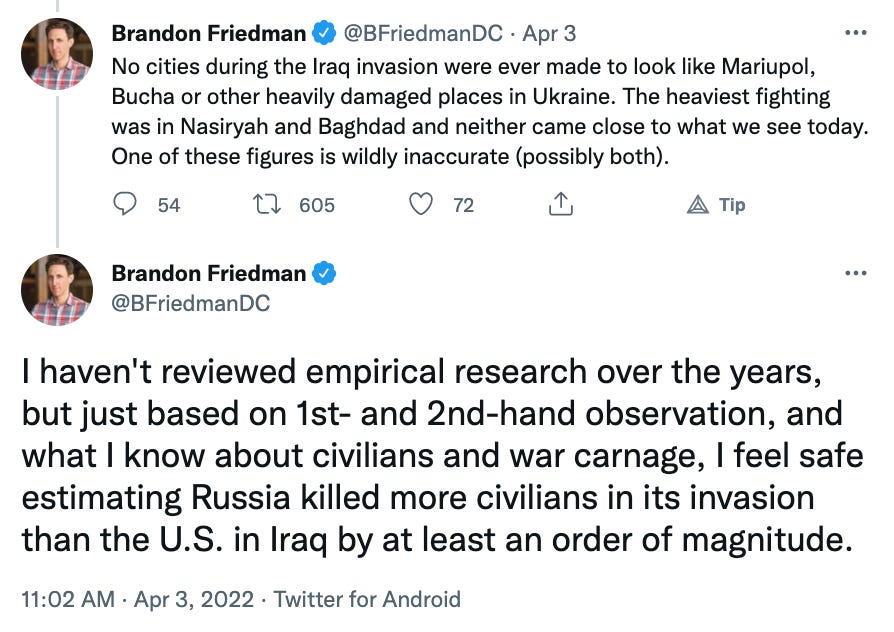 I simply don’t understand the motivation to behave like this—to use the Russian invasion as a way to protect the seemingly impenetrable borders of the American exceptionalist myth, or to acknowledge war crimes only to wave them away. Why are people ranking things? Why is anyone trading war crimes stats like this was fantasy football?