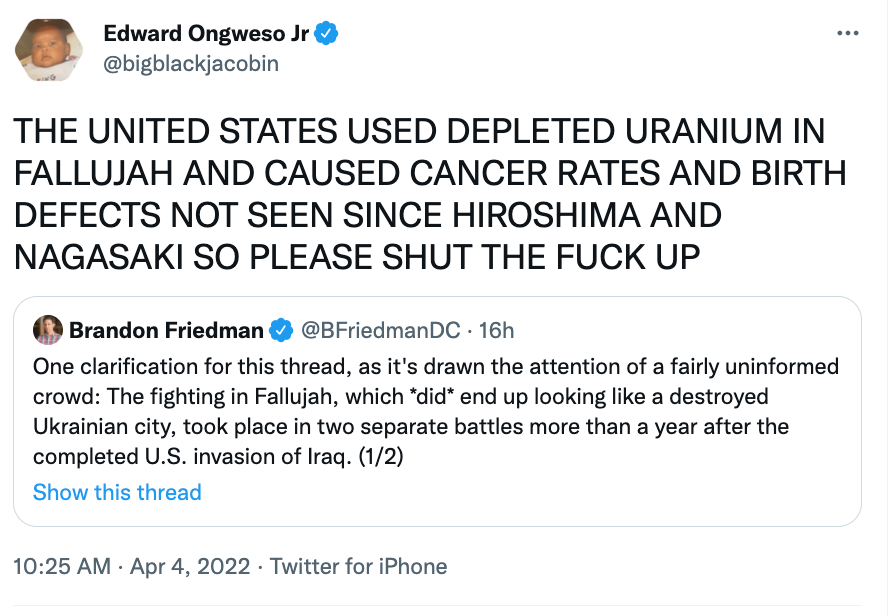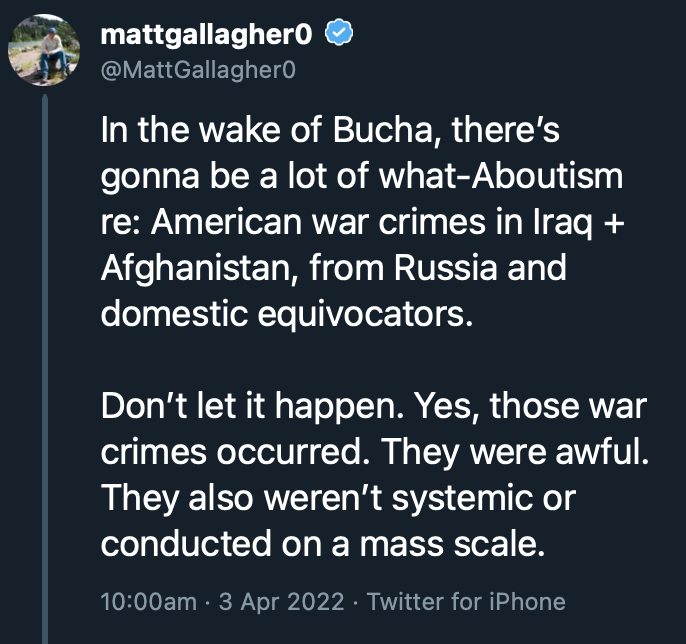 It baffles me that people think you have to somehow choose between the two, rather than recognize that these are features of war, that there are precious few clean hands when it comes to war, and that, if we want there to be less violence and heartbreak in the world, we should be just as vigilant about what the people who purportedly represent us do as we are about the people on the “other side.” No more Buchas, no more Mariupols, no more Groznys, no more Srebrenicas, no more Fallujahs, no more Sabra and Shatilas, no more My Lais, no more Hadithas, no more Kabuls, no more Abu Ghraibs, no more any of it. That does not really seem like too much to ask.