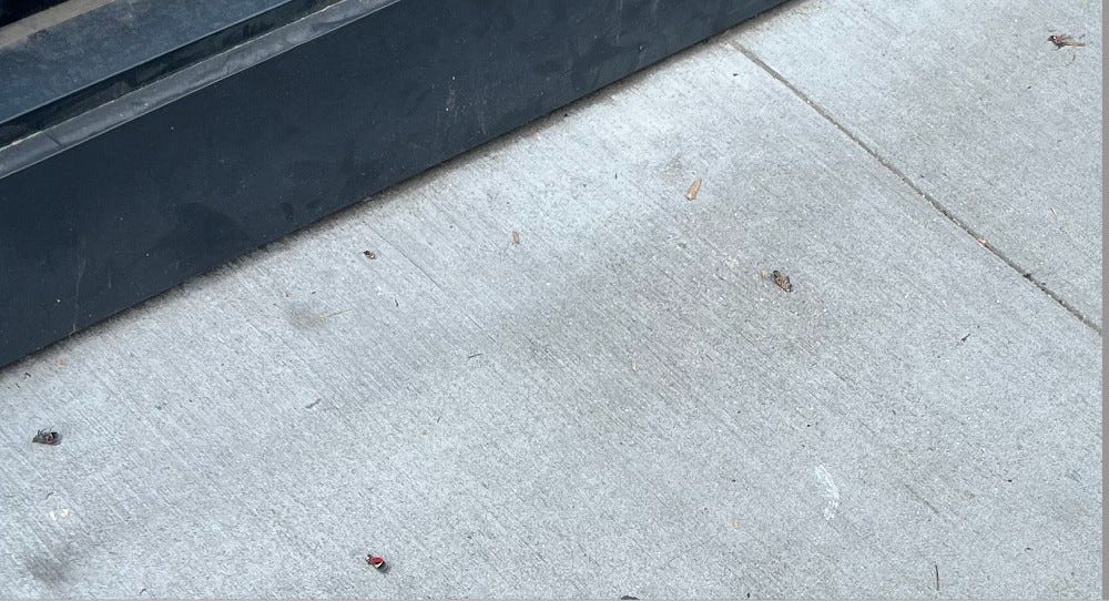 What’s more, I’ve begun to sense that the lanternflies are wilier this year than last. In 2022, there weren’t so many of them and they seemed pretty slow-moving and dimwitted. Now, they’ve descended en masse and have suddenly gotten much better at evading the common human shoe. You might say, “but what about the picture above with all the dead lanternflies?” Well, just outside the frame of that picture were a ton of alive lanternflies, and they were not going anywhere. It’s like they’re taunting us with their newfound skills.