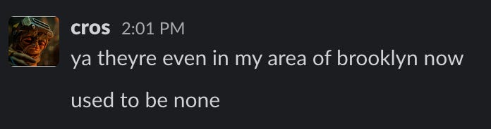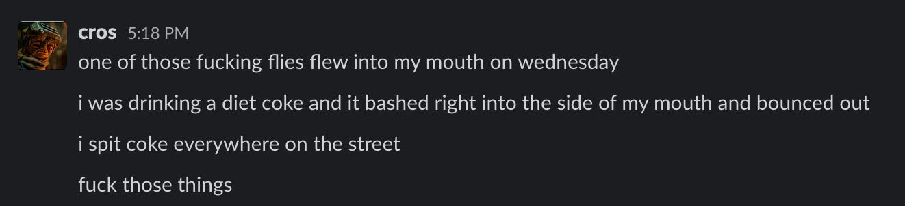 But here’s the problem: the lanternflies don’t seem to be getting the message. They are everywhere these days—in the parks, on the streets, presumably menacing our youth and scaring our more excitable pets. And they’re hanging around in clusters more than they were. I did some reporting (asked in Slack) and found I was not alone: