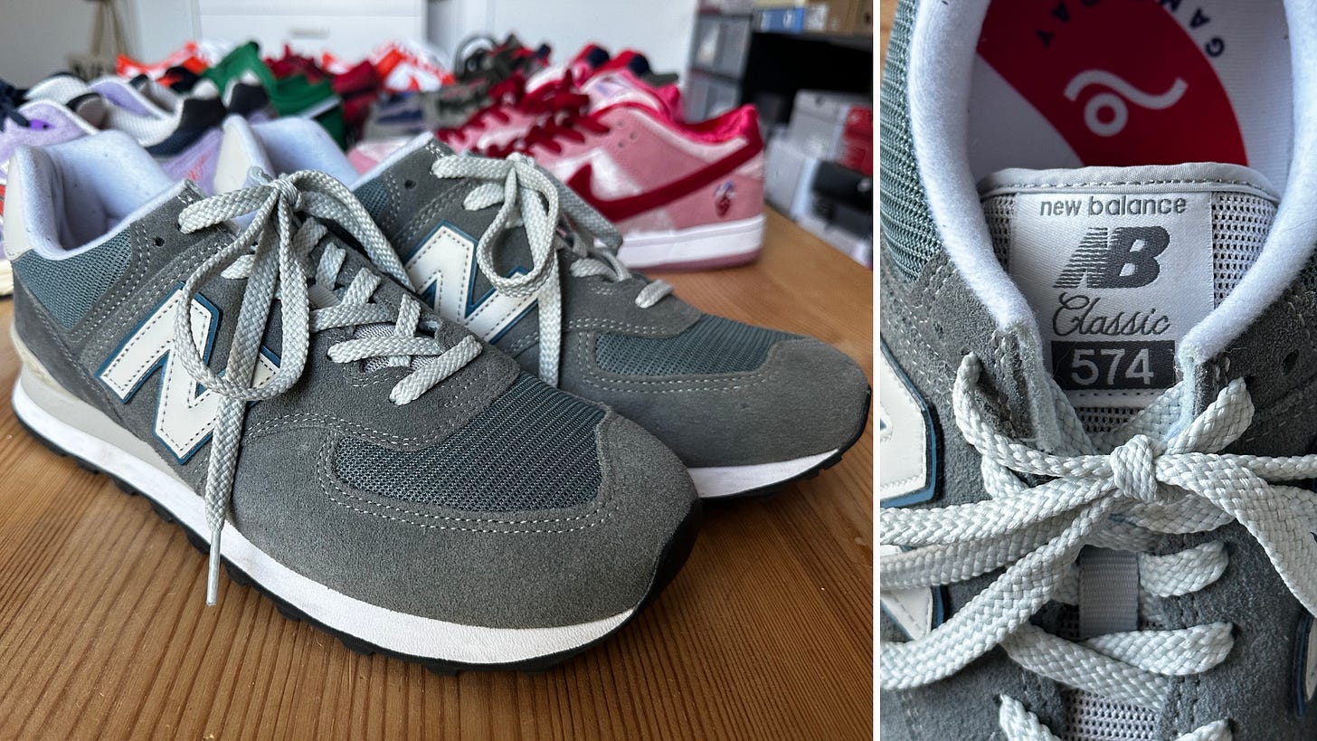 The New Balance 574. The best shoe of all time has to be well made, comfortable, and accessible to people, so I'm not gonna say some stupid Louis Vuitton Air Force 1. I think it’s $110, but for sneakers that's affordable. It's always in stock. New Balance is miles above Nike, Adidas, Puma, Under Armour.