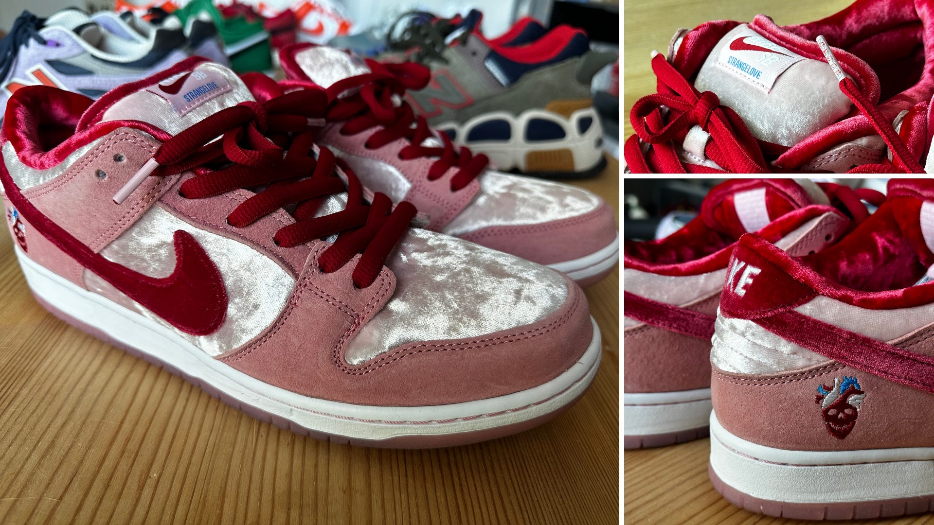 The StrangeLove Nike SB Dunks, a 2020 collaboration between the Nike skateboarding division and skateboarding brand StrangeLove. Brands will collaborate with people or boutiques on shoes, and those are often the most hyped. It’s a beautiful shoe, all velour, and it's Valentine's Day themed. I would never be able to get them again because they're $1,000 resale, whereas I could replace the shoes I wear the most.