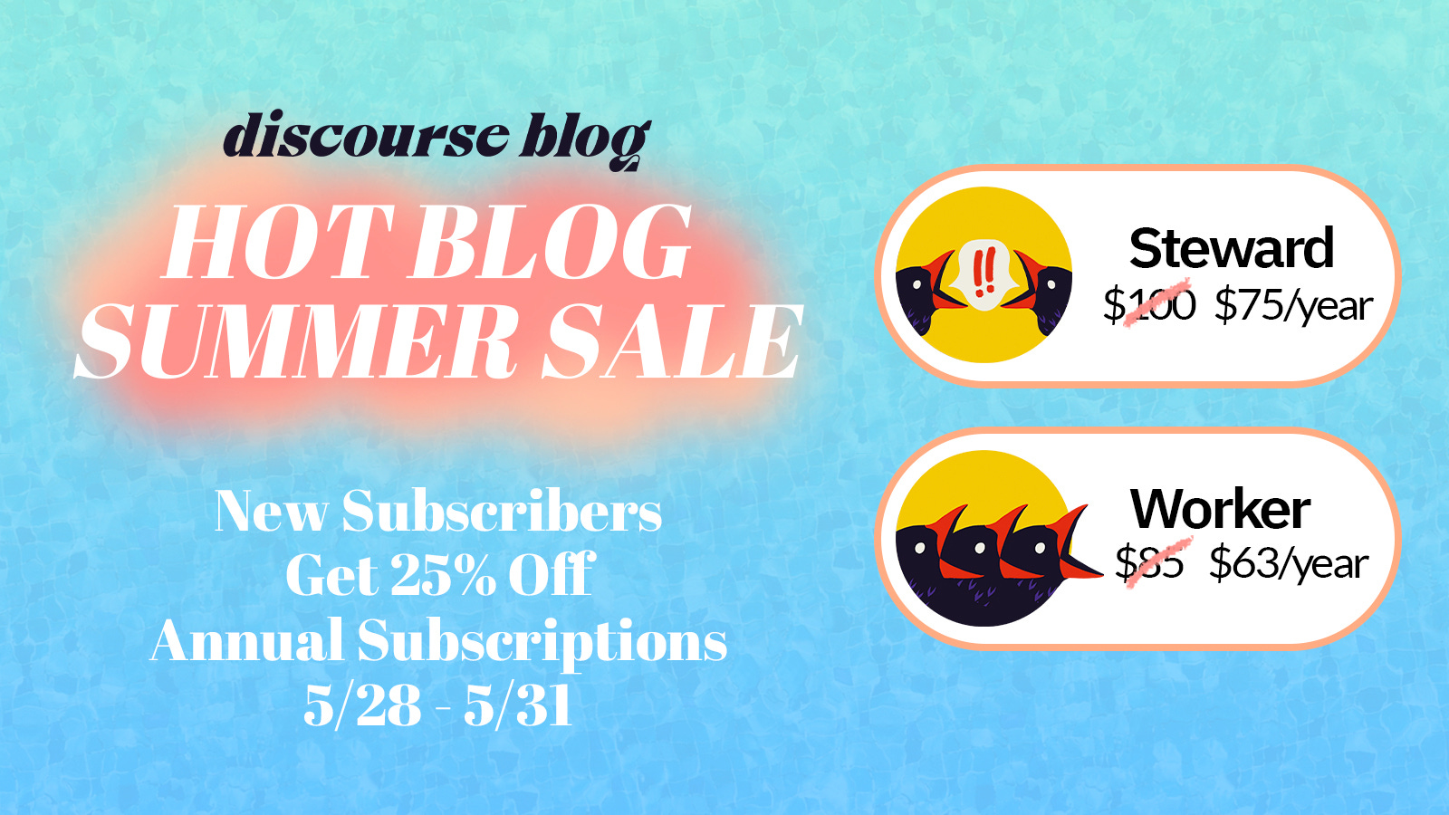Now through Monday, new subscribers can get 25% off all annual subscriptions to Discourse Blog.