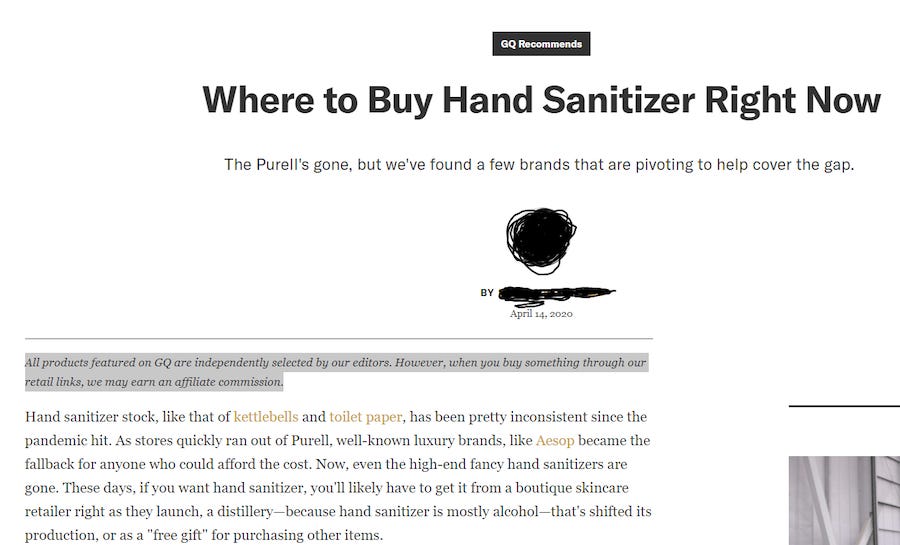 The coronavirus panic has led to many things of course, including a dire shortage of hand sanitizer in most stores around the country. In some cases, it's still available to buy online, which has led us to this: companies running affiliate-link articles of luxury brand hand sanitizer to capitalize on the shortage and the last few days of the good Amazon margins before things get tighter next week.