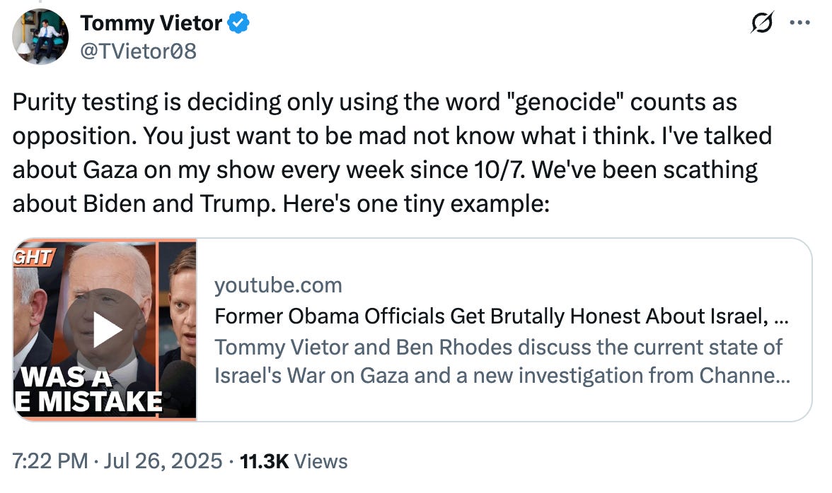 If your response to these sudden displays of supposed empathy with the people of Gaza, who are being deliberately starved to death by Israel and the United States, is to say “fuck you, where have you been for the past two years,” well, it’s nice to meet another member of the crew. But wait! Hold off on that outrage, because former Obama aide and current Pod Save America host Tommy Vietor wants to scold you.