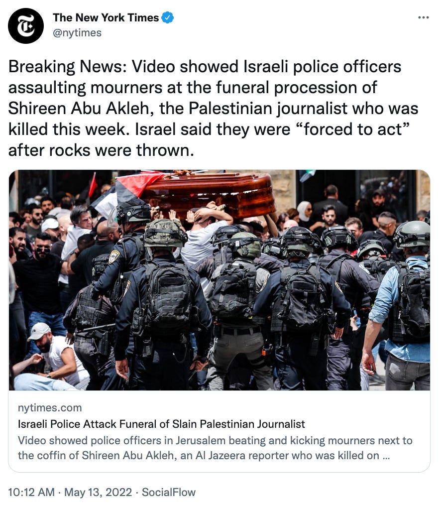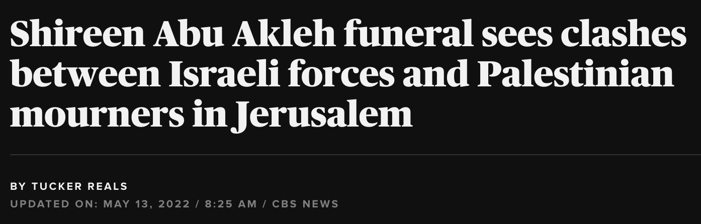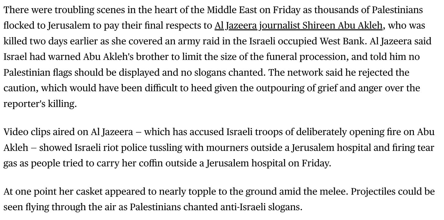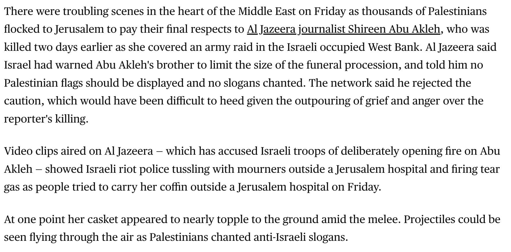 Where to even begin? Note the emphasis on Israel “cautioning” Abu Akleh’s family not to make the funeral too big or too Palestinian, as if that is sensible guidance and not barbarity in and of itself. Note the anodyne word “tussling,” or the equally anodyne phrase “troubling scenes.” Note the detail about “anti-Israeli slogans,” which, gee, you might expect when Israeli soldiers are attacking a funeral.