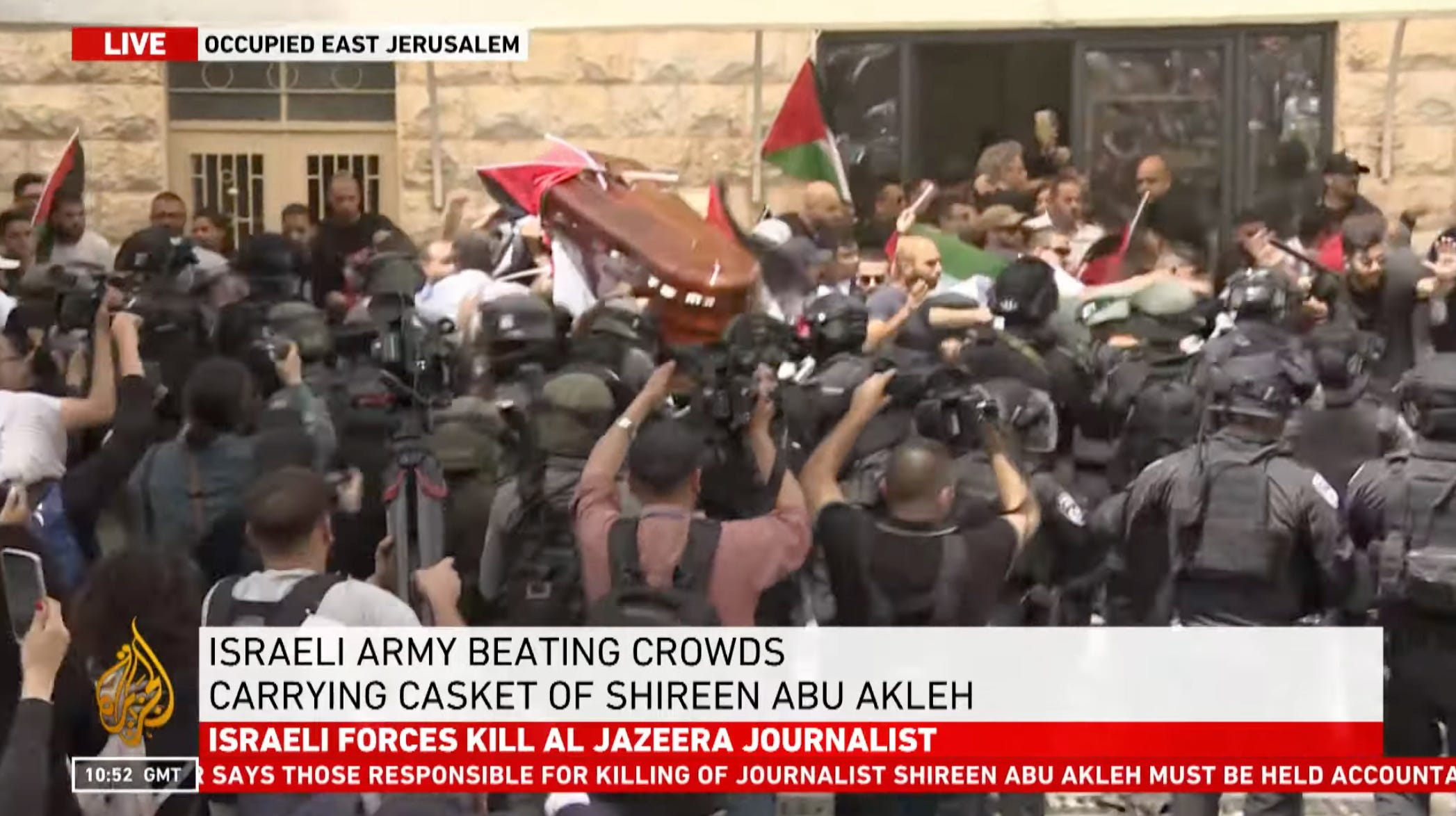 Earlier this week, Israeli forces shot and killed Al Jazeera journalist Shireen Abu Akleh in Palestine. Today, Israeli forces attacked the funeral procession carrying Abu Akleh’s casket, beating members of the crowd and at one point nearly causing the casket carrying her dead body to fall to the ground.