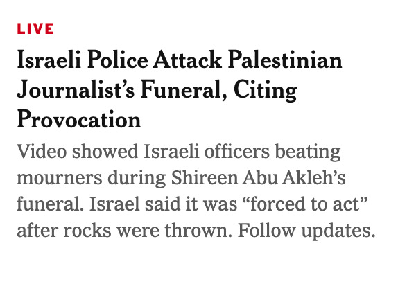 It’s certainly not as bad as the others, and the story it links to is a definite improvement on the paper’s rather rancid coverage of Abu Akleh’s death (a real headline from Thursday: “Bullet Is Focus of Dueling Investigations in Journalist’s Killing”), but nevertheless, the Times can’t help but shoehorn in Israel’s pathetic excuse for its actions. This is what contorting yourself for the sake of “balance” does—it makes you look ridiculous, and it makes you a tool of remorseless propagandists.
