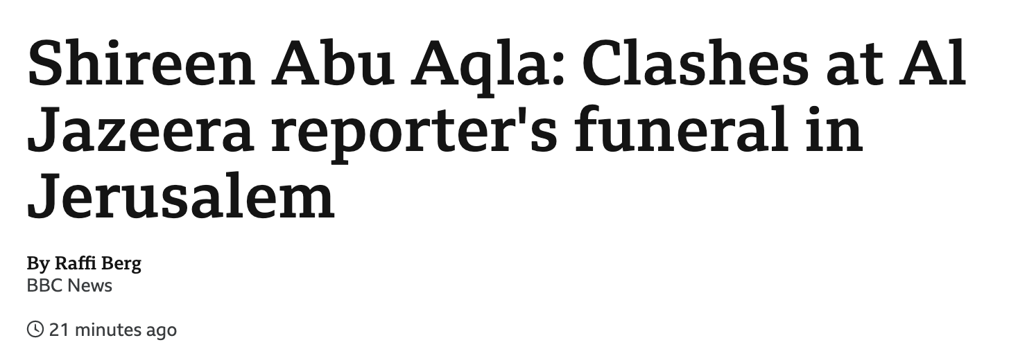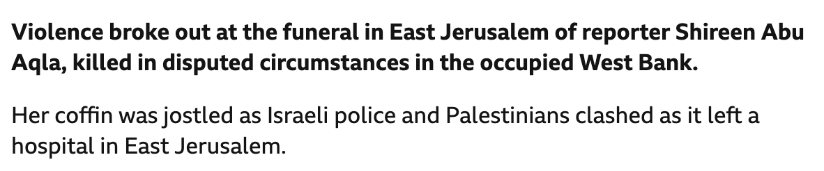 A couple of months ago, I wrote that Palestinians deserved the same kind of coverage that Ukrainians resisting the Russian invasion were getting. So just imagine for a moment that Russian soldiers attacked the funeral of a Ukrainian journalist. Would the BBC and CBS cover that atrocity in this way? Would the Times so prominently include whatever lies the Russians made up to explain themselves? I think we all know what the answers to those questions are. For god’s sake, do better. Just tell the truth. It’s not that difficult.