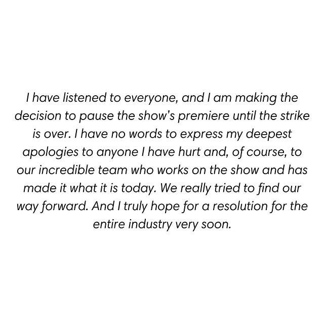 First up, Drew Barrymore. After initially defending her decision to ignore an industry-wide labor action by posting a weepy (since-deleted) video testimonial about how bad she felt, and how the world needed her show to get it through the dark, scary times (like covid and also people on her staff asking for a living wage), Barrymore made an abrupt about-face this week, vowing to stay off the air “until the strike is over.”