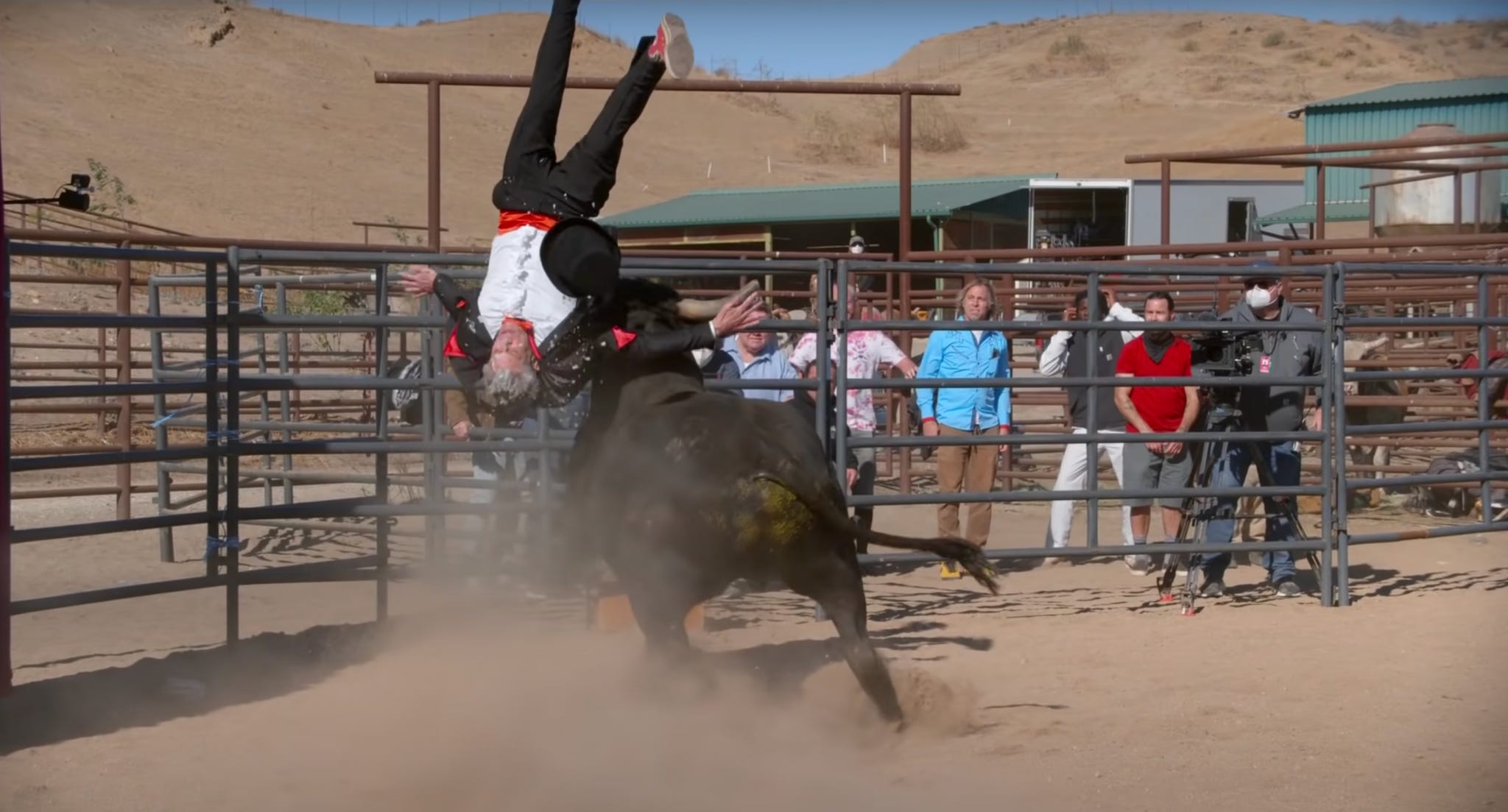 About 45 minutes into Jackass Forever, while filming a “cup test” stunt where Ehren McGhehey gets a pogo stick driven into his balls, cameraman Lance Bangs vomits into an N95 mask. Bangs starts wretching, and the rest of the crew turns their laughter away from McGhehey’s pain and towards Bangs’. At the end of the scene, Bangs asks: “Ca…