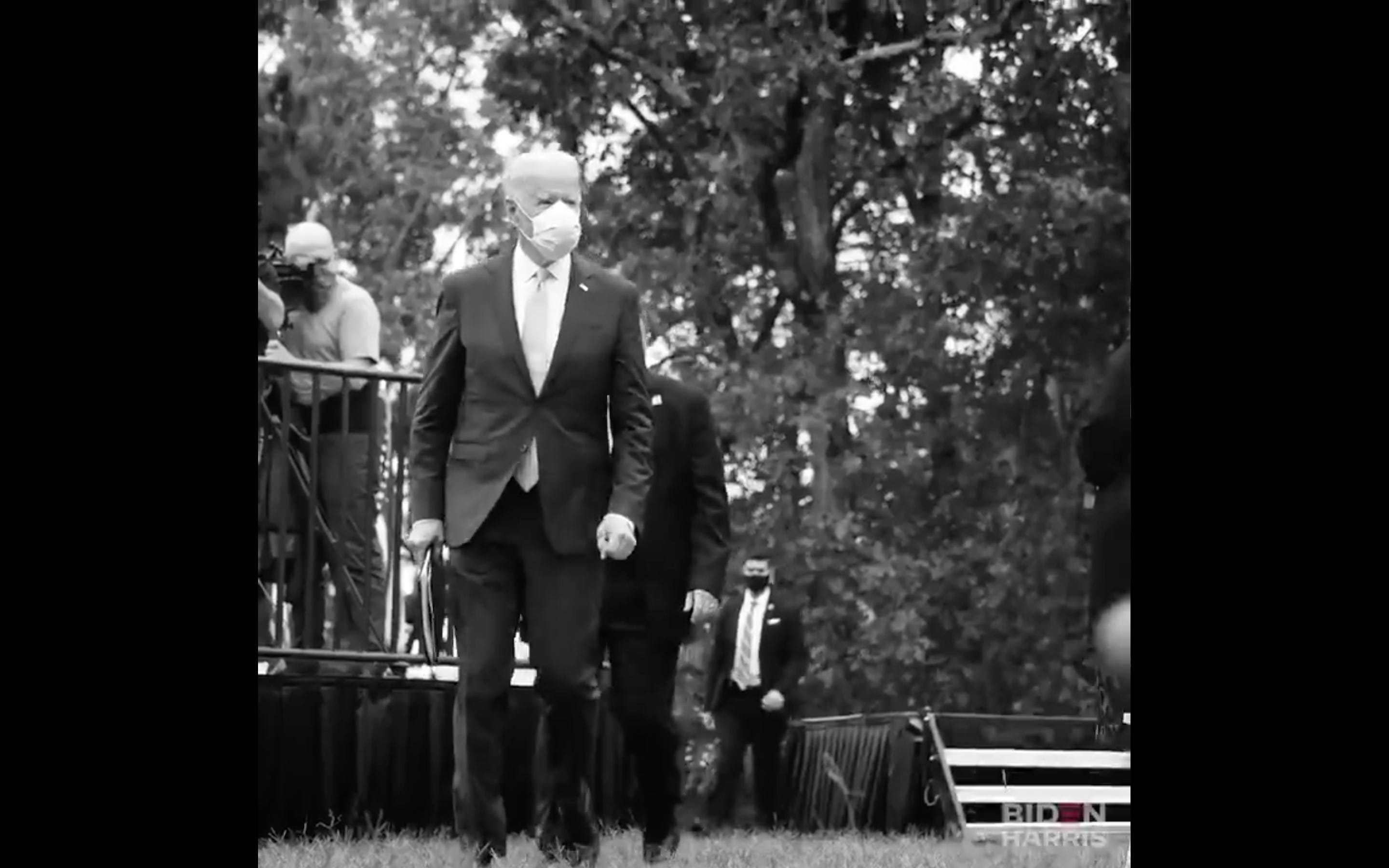 Yes, that is 77-year-old Joe Biden touting Eminem's "Lose Yourself" in a campaign video. The video itself features the song, of course, along with images of essential workers and people in line to vote and Biden in a mask walking purposefully in one direction and then in another. Also, the word "VOTE" has a prominent role throughout.