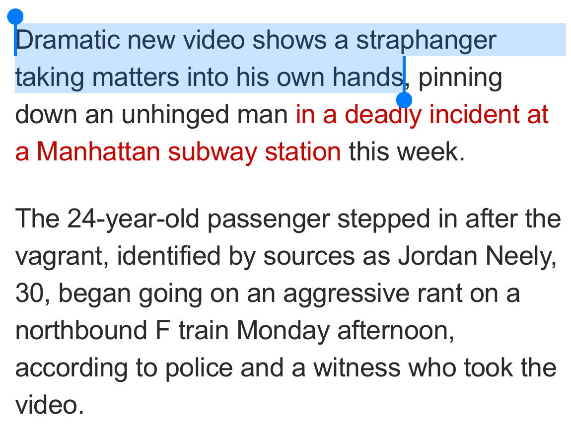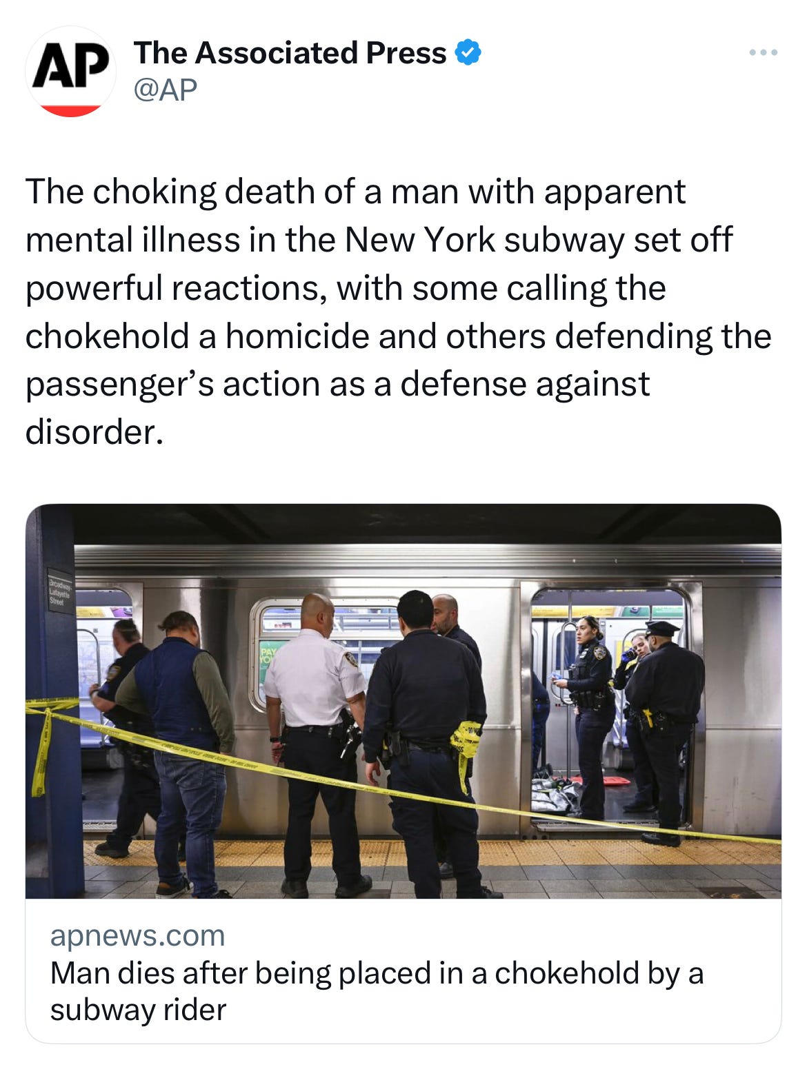 I suppose this crime against Jordan Neely's humanity is one of the "many cases where passengers assist other riders": the passengers who actively assisted Mr. Neely's anonymous executioner, along with those who passively bore witness to his murder.