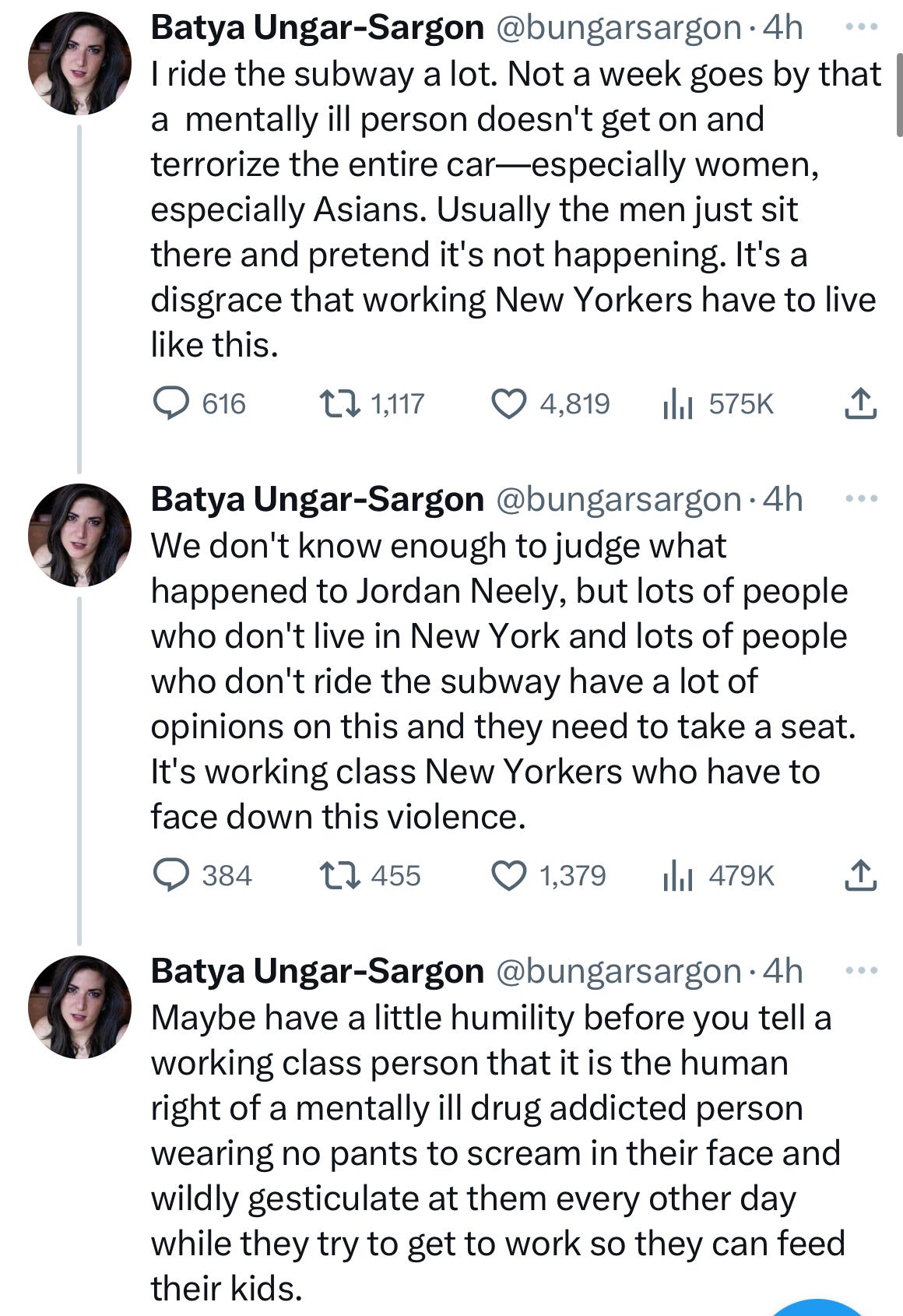 Taken together, the message you get from these statements, tweets, and reports is the same: even if you think it was wrong for Jordan Neely to have been killed, you have to admit that this situation is complicated. After all, he was “screaming” in the subway. After all, there are “fears about public safety.” After all, we need a “defense against disorder.” After all, “each situation is different.” After all, “we don’t know enough to judge what happened.” After all, Neely was "unhinged” and going on an “aggressive rant.” After all, there were “serious mental health issues at play here.” After all, “we cannot have people with severe mental illnesses on our subway system.” After all, “there are consequences for behavior.”
