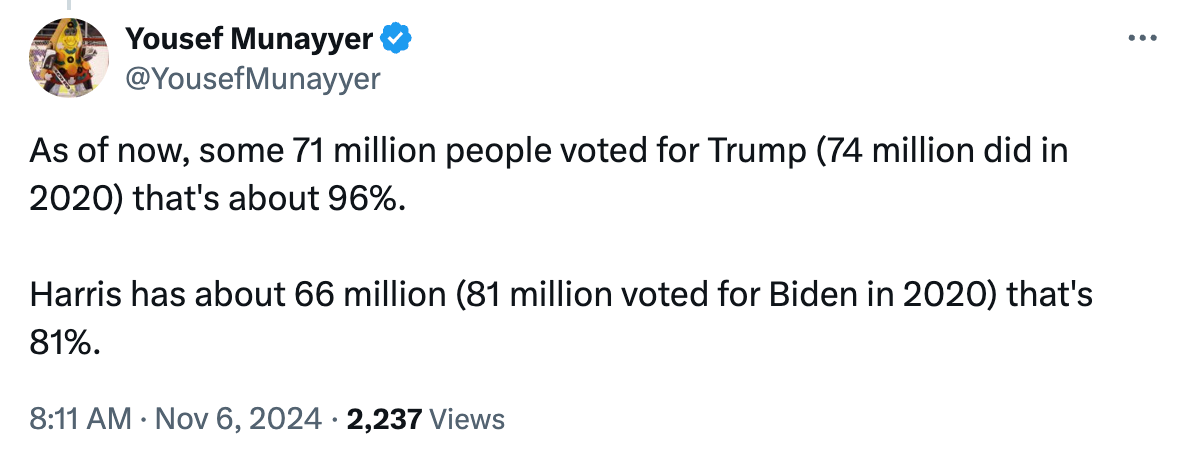 And, last but certainly not least, Harris and her campaign went out of their way, repeatedly, to show their contempt and disrespect for voters pleading with her to take even the smallest steps to end the genocide in Gaza. She made the calculation that not enough people cared about the horrors that she and the rest of the Biden administration were helping to perpetrate to make it worth her while to earn their votes. She sent fanatical Zionists like Ritchie Torres and racists like Bill Clinton to Michigan. She did everything she could to tell Muslim and Arab voters, and anyone else in despair about the genocide, that their concerns were meaningless to her. Contempt, contempt, contempt, all the way down.