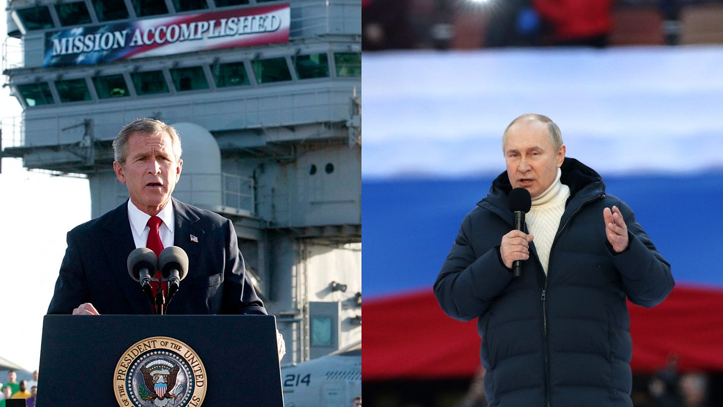 But even so, it is remarkable how much the wars in Ukraine and Iraq resemble each other. Think about it. Both wars were started on a tissue of lies. Both Vladimir Putin and George W. Bush fed their respective countries fantasies about a righteous war that was both necessary and easy to win.