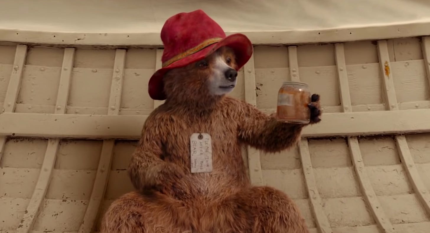 Paddington, we know it's not true that you don't like marmalade. It is your sun and your moon, and also the thing that prevents you from starving and dying. Do not insult yourself, or us, by pretending otherwise in service of the most tiresome day of the year. Marmalade is what has made you the wonderful bear you are. Embrace that, always! You are usually the giver of hard stares, but today, sadly, you deserve to be the recipient of one.