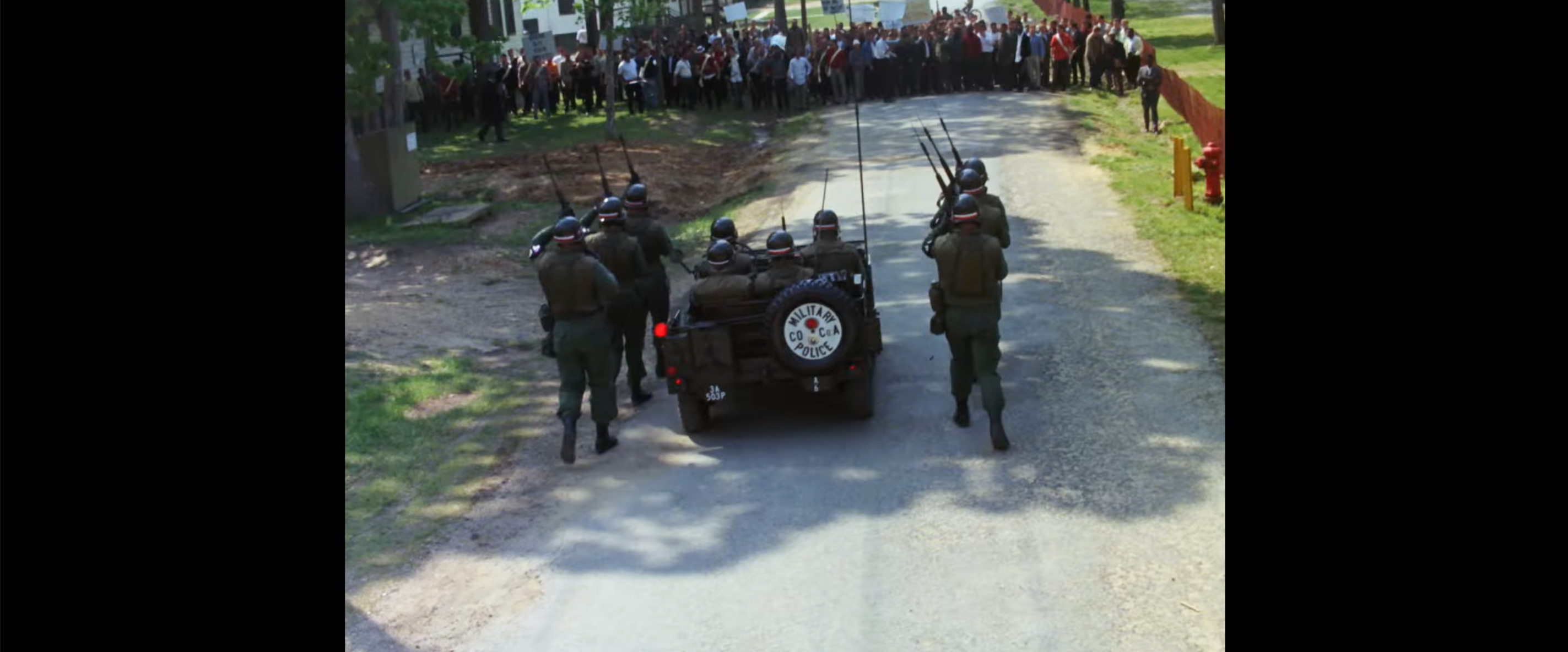 Riotsville, USA is ostensibly about the late 1960s—specifically about the very real, and very weird, decision by the U.S. Army in 1967 to create an entirely fake town called Riotsville on a military base in Virginia in order to train soldiers to quell the Black uprisings that had spread throughout America over the past few years. It is told entirely through a collage of archival broadcast and government footage, anchored by Haslett’s vivid script and Charlene Modeste’s hypnotic narration.