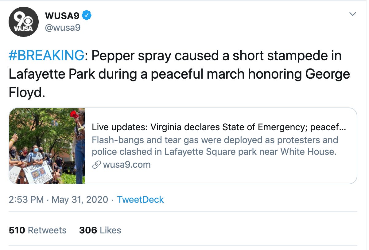-“WUSA9 Reporter Matt Gregory and Photographer James Hash were tear-gassed on Live TV while reporting at the scene of the protest.”