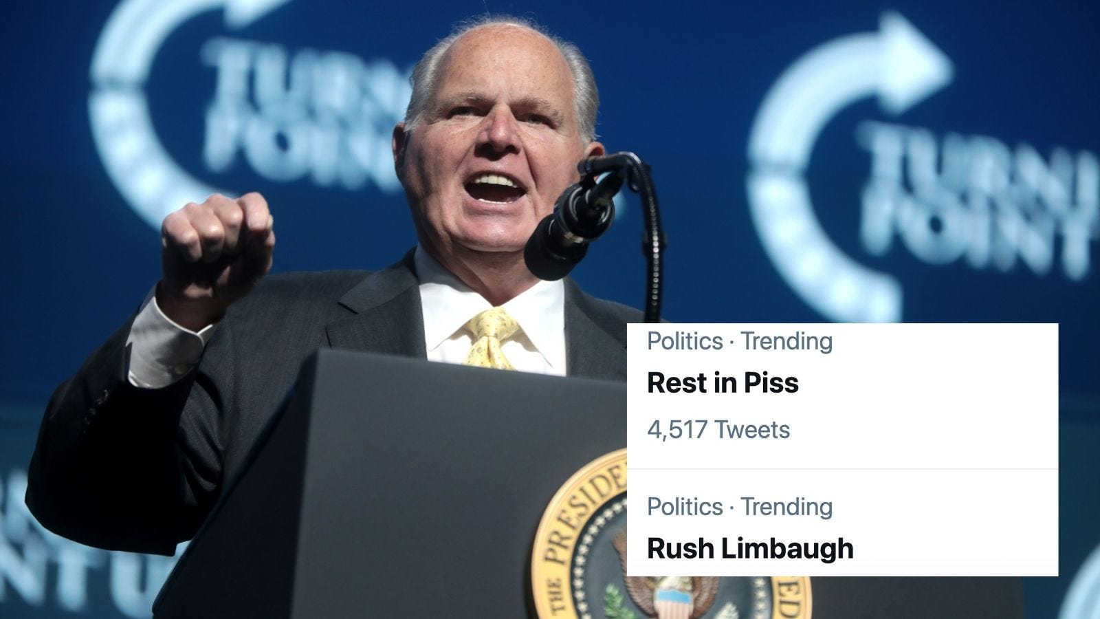 Far right conspiracy theorist and radio jockey Rush Limbaugh has died of cancer. He was 70. He was also a huge asshole who wrote the guide on spewing racist, misogynistic, homophobic, Islamophobic, and generally outright hateful shit for a living. He was such …