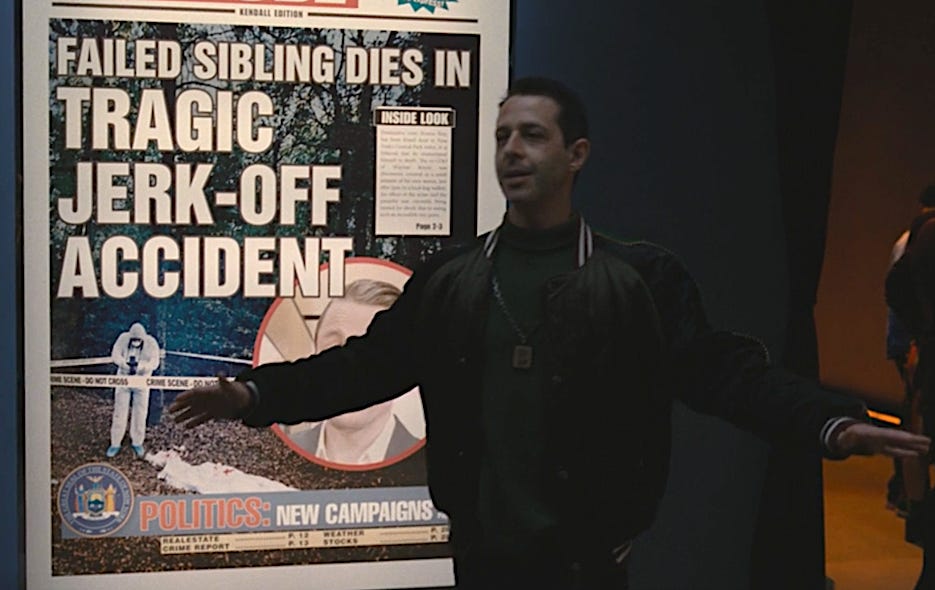 Finally, there's Connor, whom Kendall mocks in a blown-up, fake tabloid cover for "shitting a bag" when he took his younger brothers on a camping trip, and whose arm is in a complicated-looking sling because he took a tumble dancing an Irish gig over polling data that showed him nearing one percent (that's four million people, he tells his laughing siblings). The one bright spot was that "girlfriend" Willa defends his fledgling political career and rebukes Comfry for trying to make him take off his coat at Kendall's behest. (He absolutely doesn't take that coat off!)