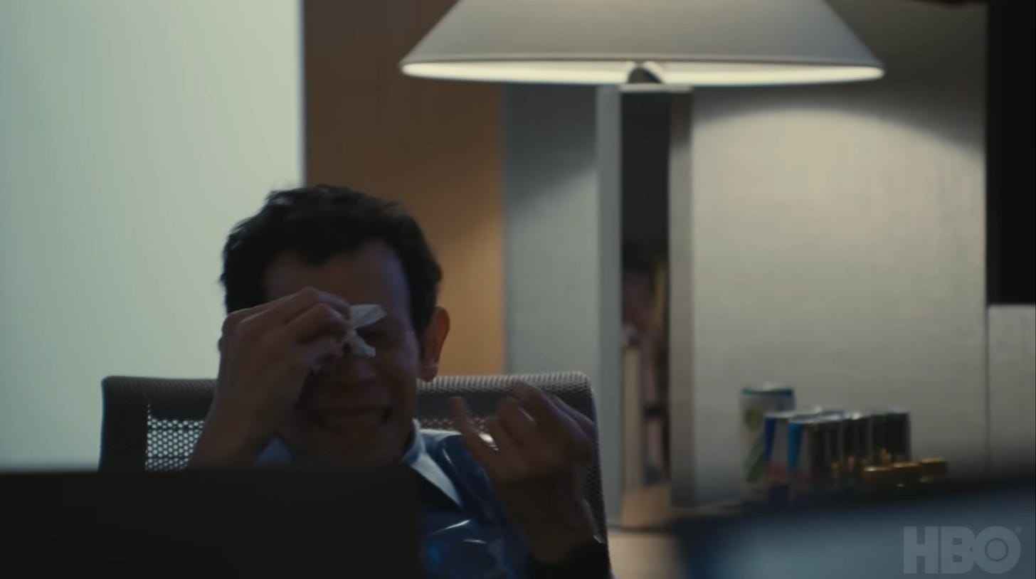 “America Decides” is many things—a stellar hour of TV; the third-to-last-episode of Succession ever; a brutal reminder that all of these people are actually evil—but, if it is anything, it is The Wasabi Scene, in which Decision Desk guy Darwin is attacked by Greg with both wasabi and a lemony La Croix right in his eyeballs. “Wasabi straight into my corneas” is actually a pretty good metaphor for this episode: scalding, painful, and very, very spicy.