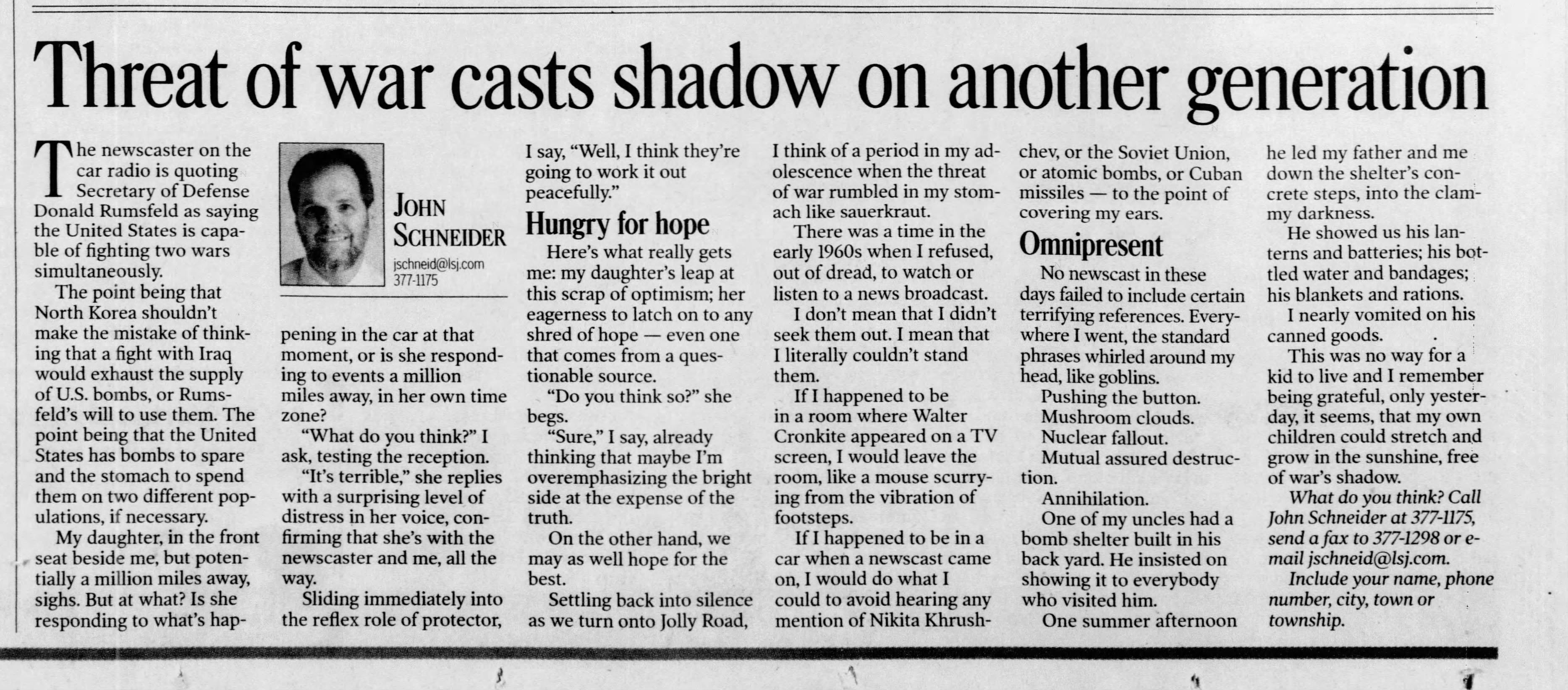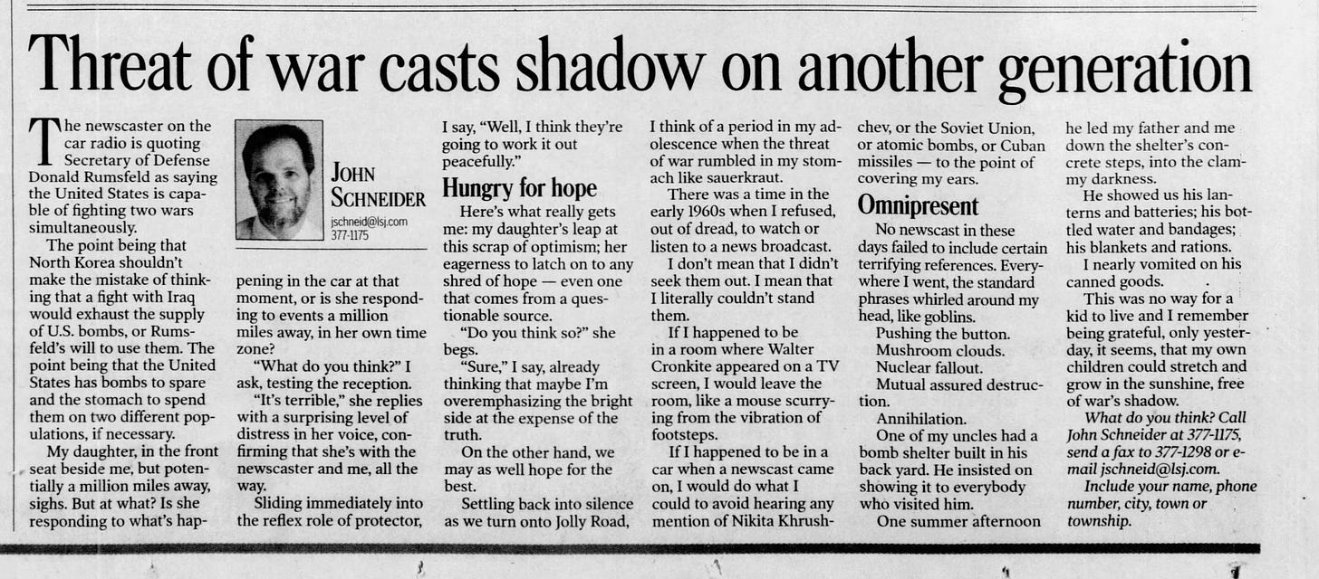 My dad and I talked about it as we drove, and he reassured me that things were going to be okay. But part of why I remember this so well is because he wrote an article about it in the local newspaper. In the story, he admits to steering the conversation toward optimism, potentially at the expense of truth. He admits to having his own crisis in adolescence about the threat of war, the unsettling experience of visiting his uncle’s bomb shelter, and about wishing his kids were free from the hell of such anxieties.