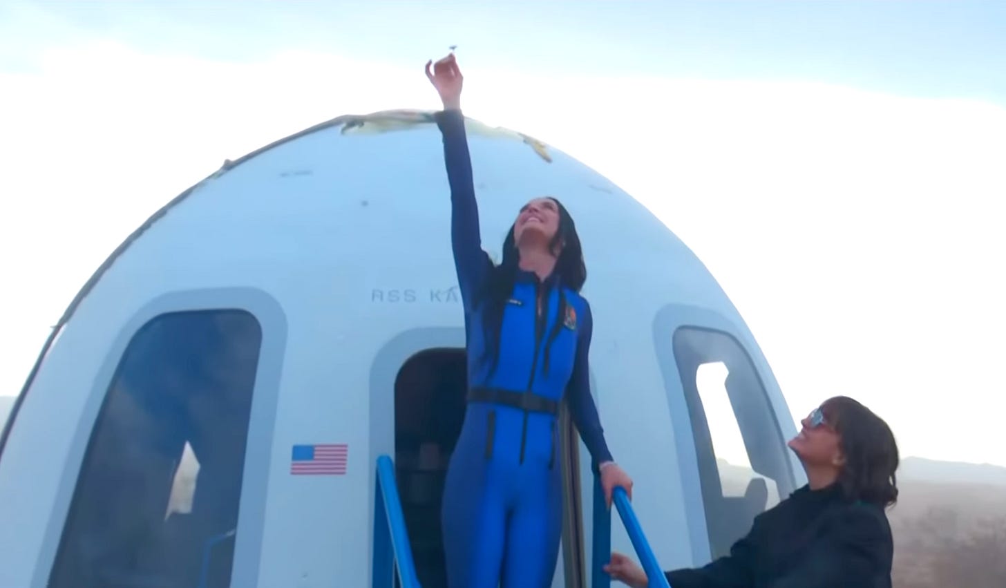 the planet is boiling and a billionaire 'roid freak is sending his girlfriend to "space" to listen to katy perry butcher a classic song. I think I'll go play in traffic