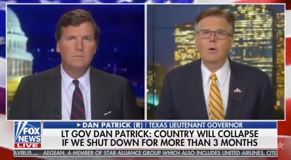 “No one reached out to me and said, as a senior citizen, ‘Are you willing to take a chance on your survival in exchange for keeping the America that all America loves for your children and grandchildren?’” Patrick told Fox’s Tucker Carlson on Monday evening. “And if that is the exchange, I’m all in.”
