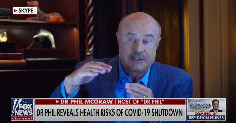 Also on Thursday, Dr. Phil went on Fox News to say, among other things, that "360,000 [people die] a year from swimming pools, but we don't shut the country down for that, but yet we're doing it for this." (360,000 people a year do not, in fact, die "from swimming pools"; in other news, Dr. Phil has no medical credentials. ) Dr. Phil magnanimously allowed that people are dying from coronavirus, saying, "I get that." Thanks.