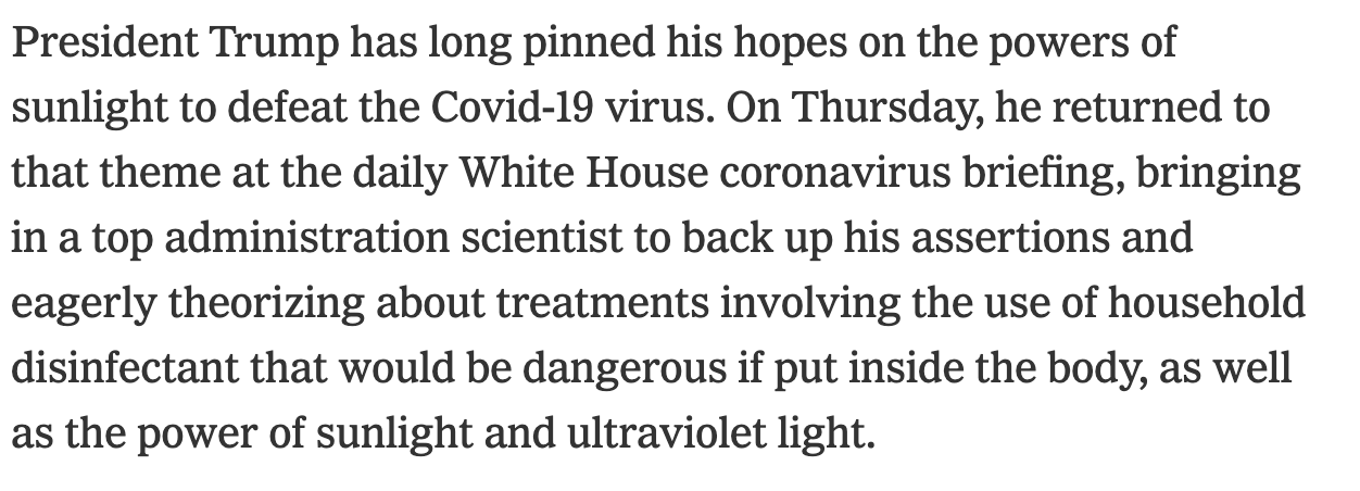 “Could” has been helpfully replaced by “would,” but even this somewhat more assertive version beggars belief, with the crucial words buried under layers of verbiage and subclauses. What is so difficult about saying, “President Trump pushed the dangerous and false idea on Thursday that an injection of disinfectant into the body could be used to combat the COVID-19 virus”? Instead, the paper of record ducks and covers.